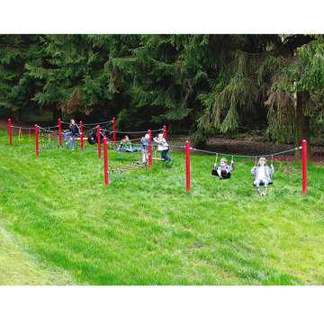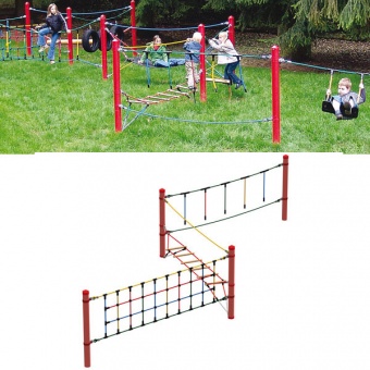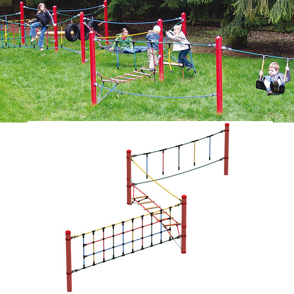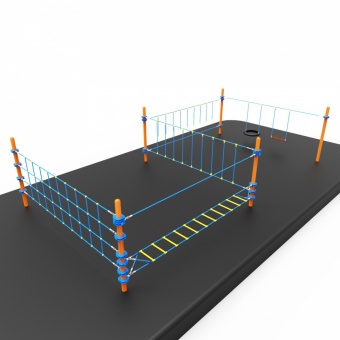 • Модуль для лазанья, представляет собой несколько опор (стальная труба, толщина стенки не менее 2 мм) и натянутыми между ними сетками для лазанья, страховочными канатами и канатами для ходьбы, веревочными балансирами со ступеньками, качелями.