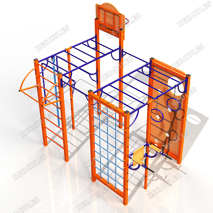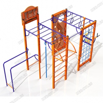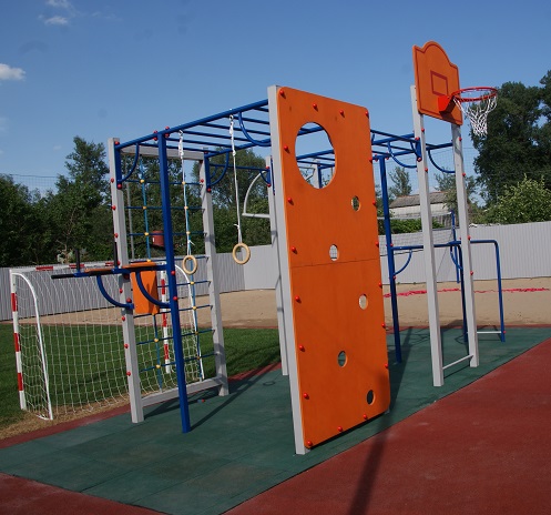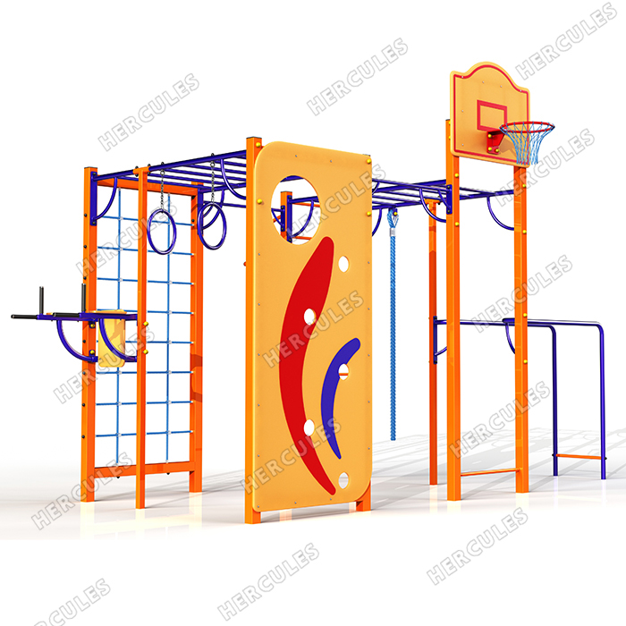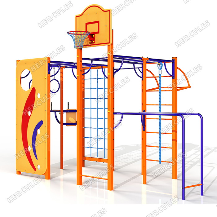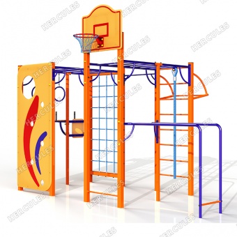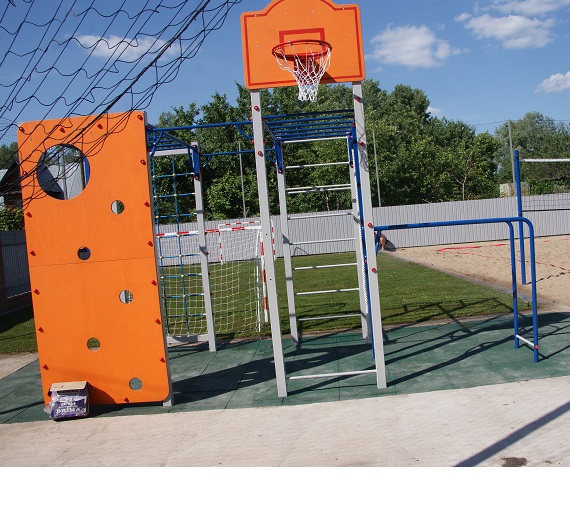 • Универсальная площадка с турниками, пресс-брусьями, рукоходом, канатом, кольцами, стритбольным щитом, брусьями, скалодромом.