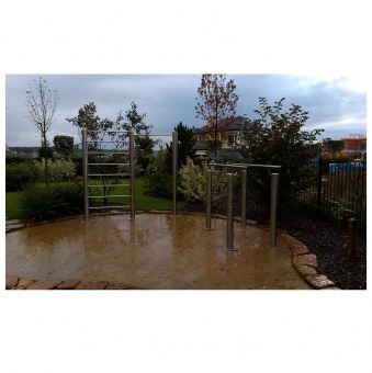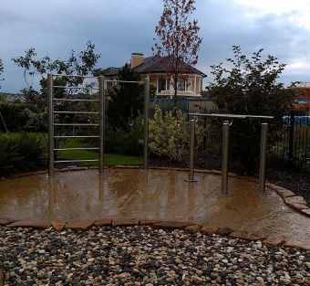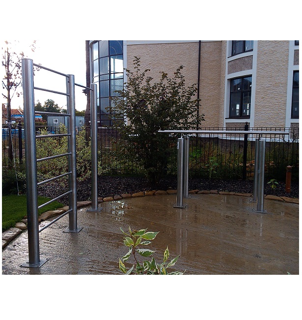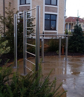 • Комплекс спортивного оборудования из нержавейки. Труба стоек не менее 102 мм, элиптические заглушки из нержавеющей стали на внешних торцах труб, перекладины турников - нержавеющий круг. Установка бетонированием (возможно изготовление комплекса для установки на бетонную поверхность).