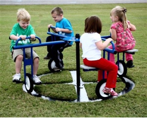 • Детская карусель в форме 4-х велосипедов. Чтобы кататься необходимо, сидя на сидении, отталкиваться ногами. Впрочем, возможно раскрутить карусель и с внешней помощью. Комплект поставки - собственно карусель с колесами и сидениями, а также дорожка для колес